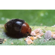 Tiny, shiny Delphastus beetle is about one quarter the size of a ladybug and feeds on several species of whitefly. Adult Delphastus prefer to dine on the eggs and larvae of whitefly consuming several hundred per day, but will also dine on spider mites. Their light yellow/green larvae also enjoy whitefly eggs consuming 100-200 eggs a day. Unlike their female counterparts which are entirely black, male Delphastus have a brown head. The female Delphastus beetle will lay multiple clusters of 8-12 clear eggs.
