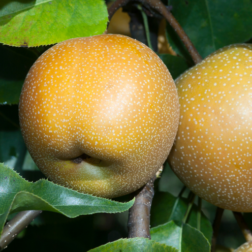 Russeted golden brown skin. Crisp like an apple when ripe. Harvest mid-August in Central CA. 450 hours. Pollinized by Hosui, Shinko, or other pear....