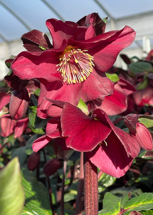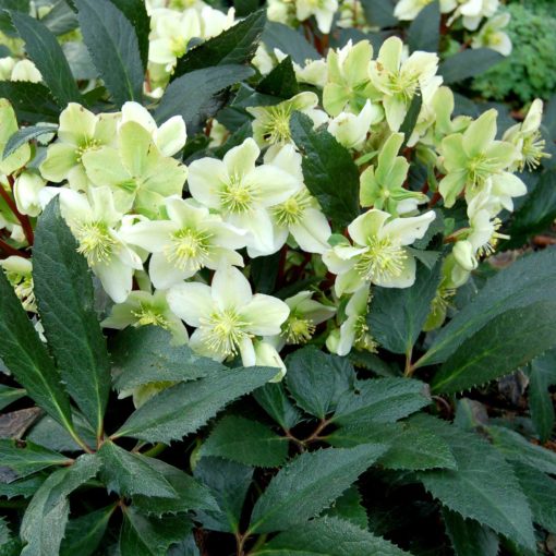 Deep red flowers emerge in winter, held outward on sturdy stems above dark, glossy evergreen foliage. With their robust form, these perennials are ...