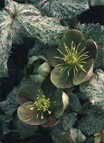 Still considered to be among the most beautiful variegated Hellebores, Pacific Frost has dark green leaves that are speckled with white; remaining ...