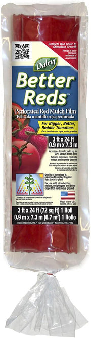 Helps grow prize-winning tomatoes by reflecting a precise spectrum of health-promoting light rays on the undersides of plants. Scientifically proven to increase tomato harvests by 20% in comparison to dark colored films. Better Reds reduces water run-off, keeps the soil cool in the summer and traps moisture and heat towards the end of the season so you can extend your harvest. Use it around your garden to grow strawberries, melons, red peppers, and other crops that fruit above ground. The red film has a ground mulching effect that stimulates early plant growth.