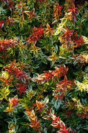 Brilliant golden-yellow variegation on green leaves make 'Kaleidoscope' our most popular Abelia. Leaves take on red and orange hues as the nights get cooler, making a true kaleidoscope of color! Fragrant white tubular flowers summer to fall attract pollinators. This low maintenance dwarf is suitable for patio containers.